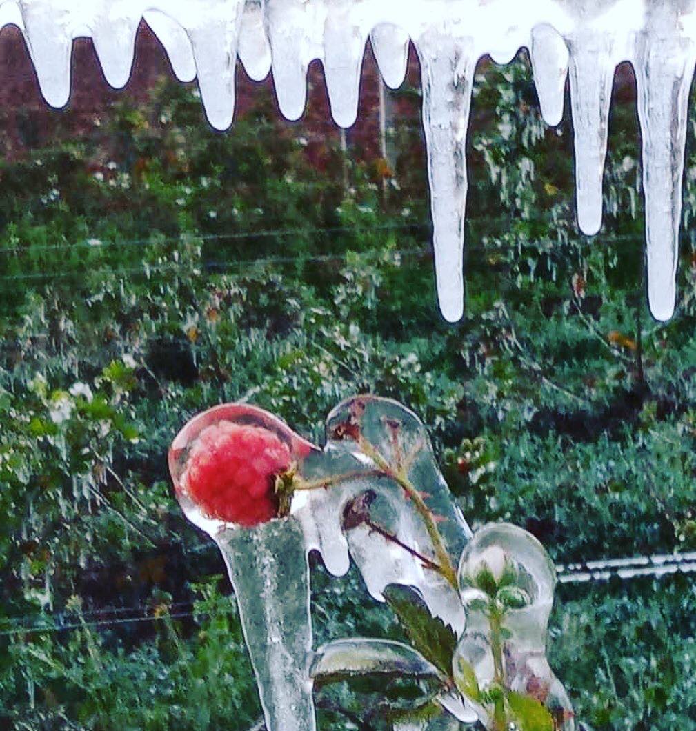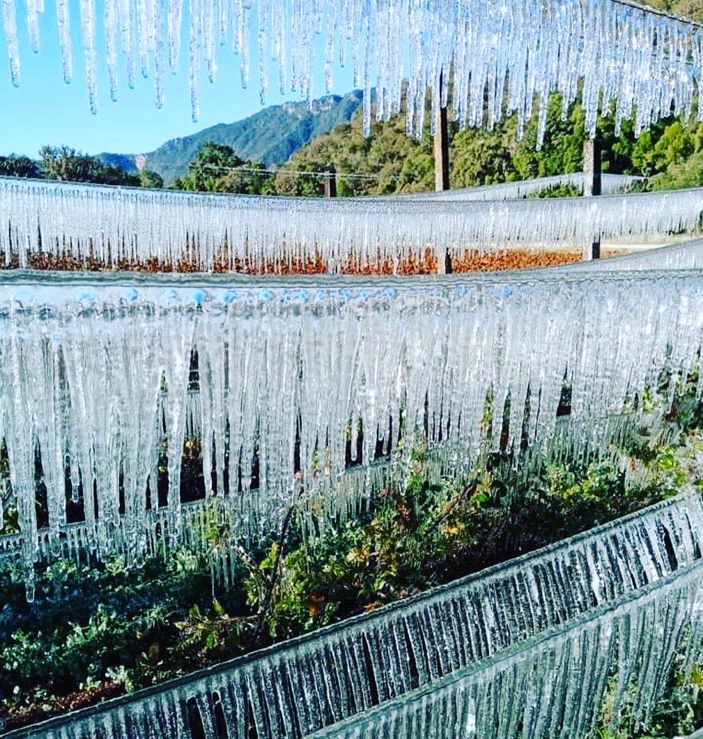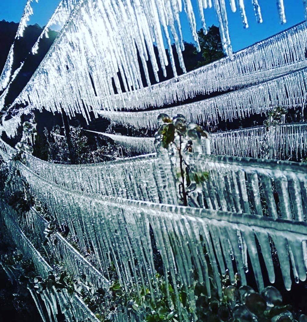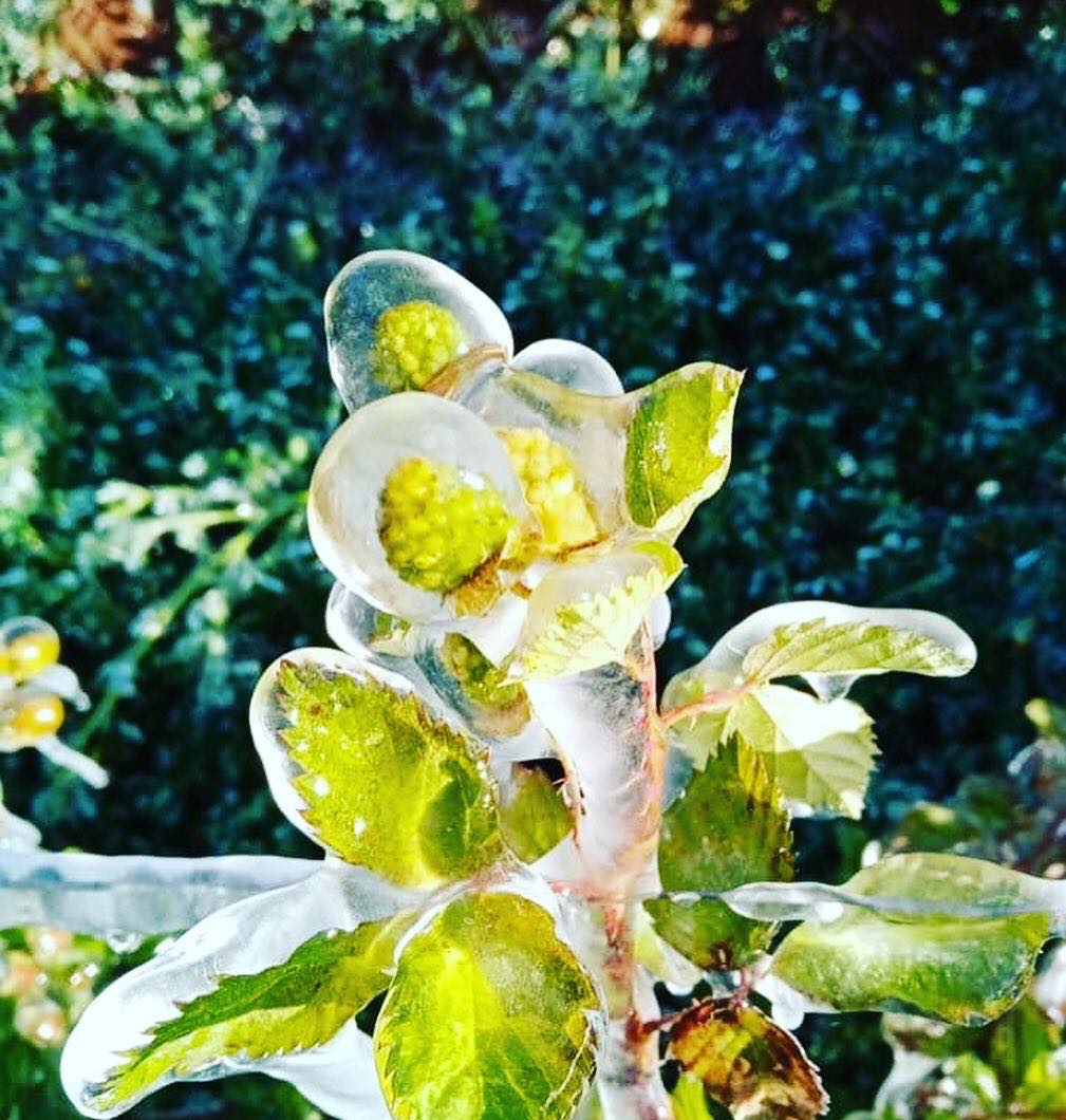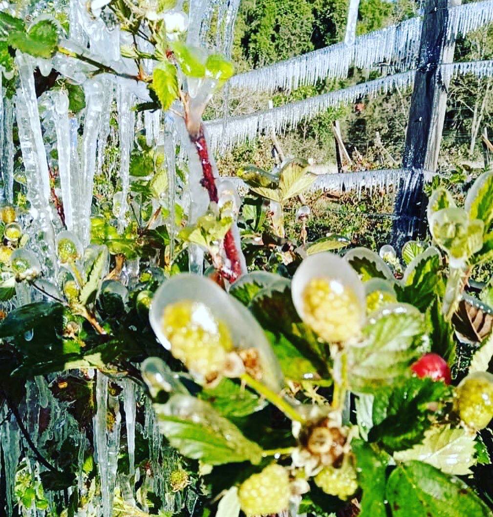 “Ya bailó la cosecha, pero gracias Dios por el espectáculo de la naturaleza”, poste el productor junto con una serie de imágenes donde se observa cómo el hielo congeló todo a su paso, formando figuras heladas que cuelgan de las plantas y que encapsulan tanto flores como los pequeños frutos que ya crecían.