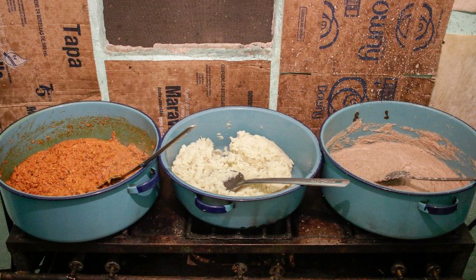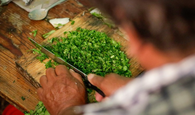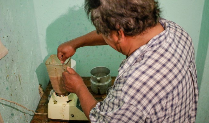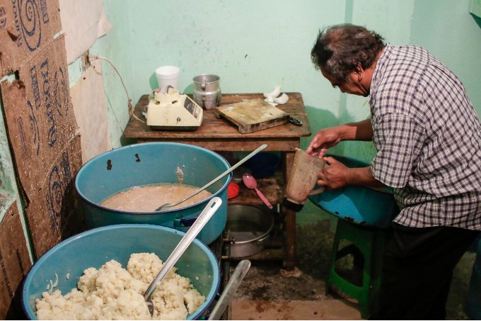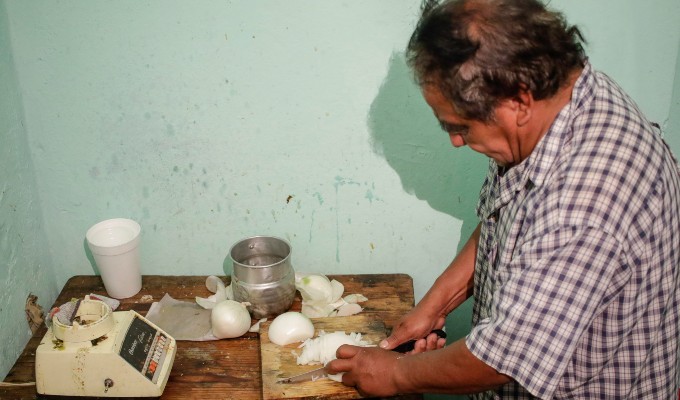 Su día inicia desde las seis de la mañana, pone a cocer el frijol, la papa y el chicharrón que desde un día antes deja preparado, muele la salsa de chile jalapeño que va acompañada de cebolla y cilantro, para después envolver los ingredientes en tortilla que va mojada con el aceite que desprende el chicharrón.