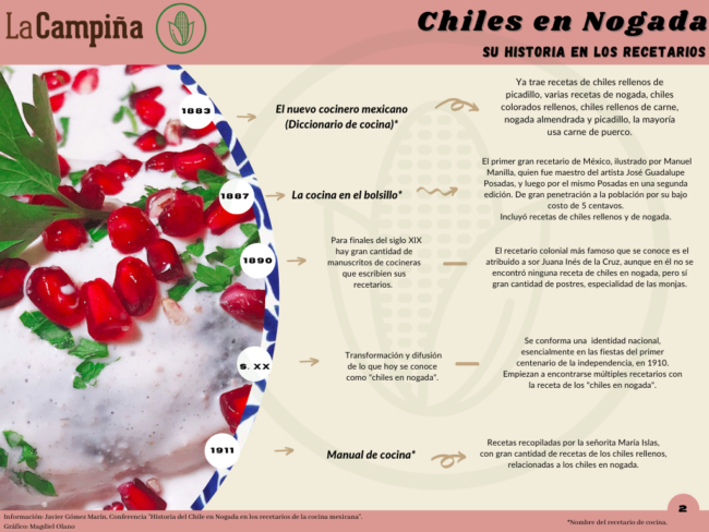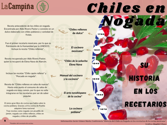 “Muy pocos recetarios de la Colonia han llegado a nuestra época y ni en ellos ni en investigaciones hemos encontrado algo que hable exactamente sobre la cocina mexicana o sus orígenes (…). Nunca se ha encontrado una receta antigua sobre los chiles en nogada, esencialmente porque los chiles rellenos y cubiertos de nogada eran un producto muy popular.
