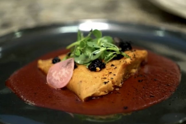 La experiencia se completó con un cóctel de tepache de guayaba y mezcal espadín, endulzado con piloncillo y limón, servido en un vaso escarchado con sal de chapulín, tortilla quemada y guayaba confitada. Un guiño atrevido, pero profundamente mexicano.