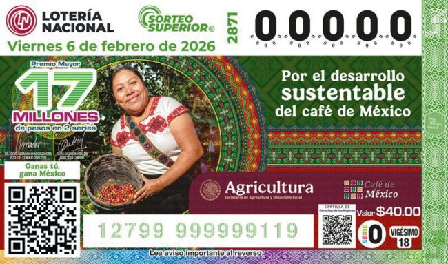 El billete conmemorativo corresponde al Sorteo Superior No. 2871, que se celebrará el 6 de febrero de 2026, con un Premio Mayor de 17 millones de pesos y una bolsa total de 51 millones. Los cachitos ya están a la venta en todo el país, llevando consigo un mensaje claro: el café mexicano tiene historia, futuro… y ahora, también, suerte.